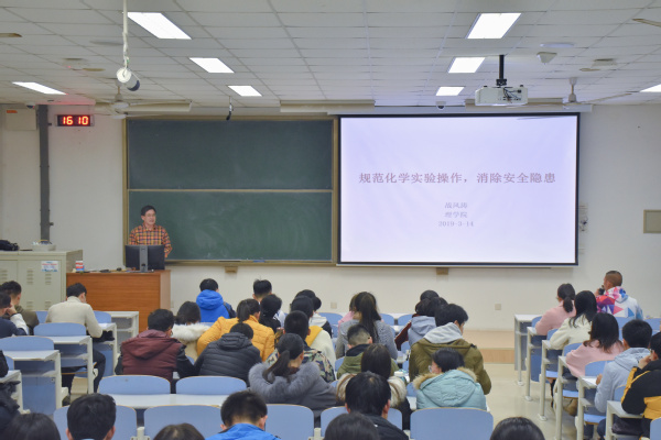 为保证实验室安全,提高学生安全意识,消除实验室安全隐患,理学院化学系于3月14日下午在南教217室召开了以“规范化学实验操作,消除安全隐患”为主题的化学安全讲座。本次讲座由化学系教授战风涛主讲。化学系2015级、2018级全体学生参与本次讲座。