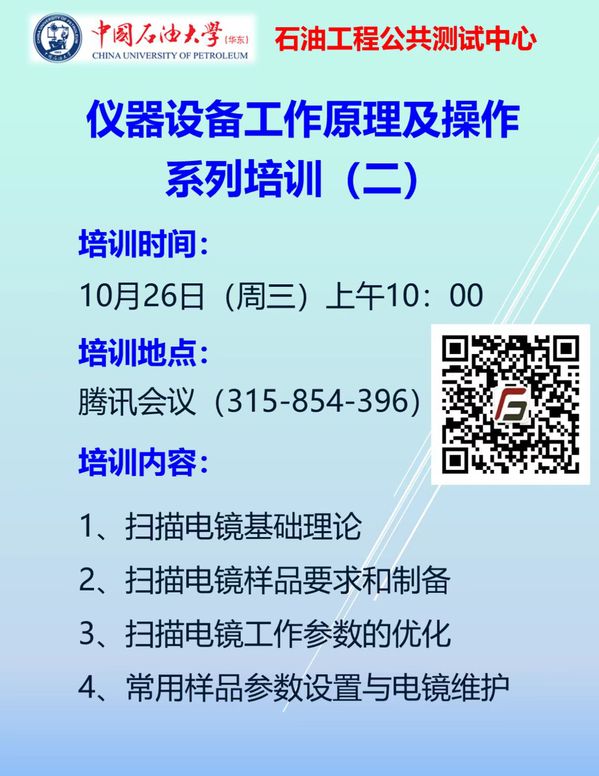 石油工程学院公共测试中心定于10月26日(周三)上午10:00举办第二期仪器设备工作原理及操作培训,具体地点和内容见海报。